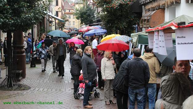 Aufgrund des regnerischen Starts zog es diesmal nicht so viele Besucher zum traditionellen Eberbacher Herbstevent wie üblich. Dennoch gab es unter Federführung der "Eberbacher Werbegemeinschaft" (EWG) wieder ein rundes Angebot aus Shopping, Information, Musik, und Kulinarischem, und das fast ohne Abstriche. Lediglich der angekündigte Auftritt der Band "Simplex" auf dem Lindenplatz fiel buchstäblich ins Wasser, da die bereitstehende Bühne nicht genügend Nässeschutz für die Instrumente bot. Beim Flohmarkt auf dem REWE-Parkplatz war das Angebot nicht ganz so reichhaltig wie sonst, dennoch ließen es sich einige Anbieter nicht nehmen, trotz Dauerregen ihre Stände aufzubauen.