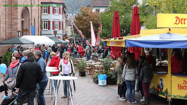 Aufgrund des regnerischen Starts zog es diesmal nicht so viele Besucher zum traditionellen Eberbacher Herbstevent wie üblich. Dennoch gab es unter Federführung der "Eberbacher Werbegemeinschaft" (EWG) wieder ein rundes Angebot aus Shopping, Information, Musik, und Kulinarischem, und das fast ohne Abstriche. Lediglich der angekündigte Auftritt der Band "Simplex" auf dem Lindenplatz fiel buchstäblich ins Wasser, da die bereitstehende Bühne nicht genügend Nässeschutz für die Instrumente bot. Beim Flohmarkt auf dem REWE-Parkplatz war das Angebot nicht ganz so reichhaltig wie sonst, dennoch ließen es sich einige Anbieter nicht nehmen, trotz Dauerregen ihre Stände aufzubauen.