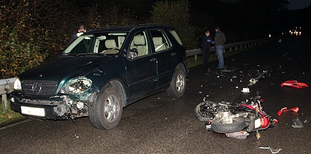 Rollerfahrer verstarb nach Zusammenstoß auf der B 45 (Foto:Wörner)(tw) Heute gegen 17 Uhr kam es auf der B 45, ungefähr eineinhalb Kilometer nach dem Abzweig von der B 37 in Richtung Gammelsbach zu einem Verkehrsunfall, bei dem der Fahrer eines Motorrollers mit einem PKW kollidierte und dabei so schwer verletzt wurde, dass er nach seiner Einlieferung in das Eberbacher Krankenhaus dort verstarb.