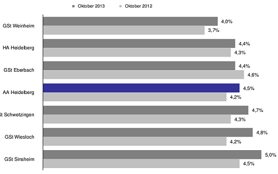 Leichter Rückgang der Arbeitslosigkeit - auch in Eberbach Arbeitslosenquoten im Oktober. (Grafik: Bundesagentur für Arbeit)(bro) (aa) Von September auf Oktober ist die Zahl der arbeitslosen Menschen im Bezirk der Agentur für Arbeit Heidelberg um 412 auf 15.800 gesunken. Gegenüber dem Vorjahr ist die Arbeitslosigkeit jetzt um 1.247 höher. Die Arbeitslosenquote im Oktober liegt bei 4,5 Prozent, - 0,1 Prozent weniger als im September.