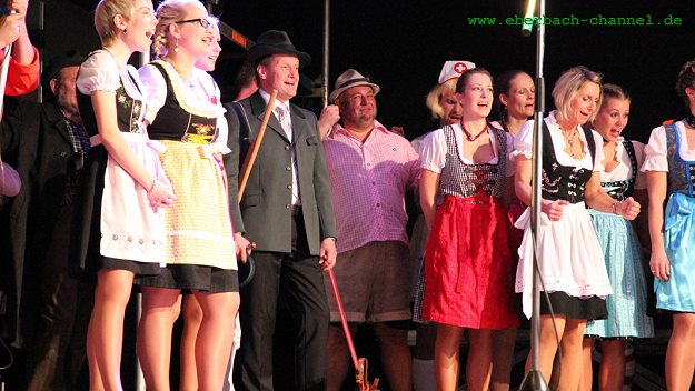 "Der Eber im Walde" ist der Titel eines Heimatfilms, der in der knapp zweistündigen kurzweiligen Show auf der Bühne im großen Saal Szene für Szene gedreht wurde. Jungregisseur Stefan Stielzwerg (Ralph Brenneis) und sein Assistent Jerome Schlappe-Kappe (Markus Scheurich) wollten mit dem Block Buster ordentlich abräumen und zogen mit ihrem Team alle Register filmischen Könnens. Hintergrund für die Story ist der Diebstahl des Bronzeebers aus der Neckaranlage im Frühjahr dieses Jahres. Die "Kuckucke" strickten darum ein Drehbuch mit viel Spannung, Action und einer Liebesgeschichte. Nachdem eine Treibjagd auf ein Hausschwein unter Mithilfe des Bürgermeisters Peter Reichert als "Oberförster" nicht den erhofften Erfolg brachte, wurden die Ganoven dann doch dingfest gemacht und der dreibeinige Eber wieder an seinen angestammten Platz zurückgebracht. Im Happy End wurde gesungen, getanzt und geklatscht und sich vor allem über den Beginn der Fastnacht gefreut.