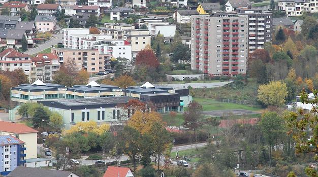 Gemeinderat legt sich auf eine Planvariante fest Zwischen den beiden Hochhäusern (rechts oben im Bild) soll die geplante Straße zur L 2311 führen. (Foto: Hubert Richter)(hr) Für eine mögliche Anbindung der Stettiner Straße an die L 2311 in Eberbach-Nord wurden in der letzten Gemeinderatsitzung Ende Oktober verschiedene Varianten diskutiert.