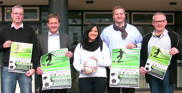 Ragucci-Cup geht in die zweite Runde V.l.: Frank Mutschler, Peter Reichert, Elena Ragucci, Christian Rochow und Tobias Soldner stellten die Veranstaltung vor. (Foto: Claudia Richter)(cr) Zum zweiten Mal wird im Dezember in Eberbach beim Ragucci U12-Cup die Elite der Jugendfußballspieler in der Hohenstaufen-Sporthalle auflaufen. Veranstaltet wird das zweitägige Sportevent vom Förderverein des VfB Eberbach. Als Hauptsponsor konnte wieder die Eberbacher Firma Antonio Ragucci gewonnen werden.