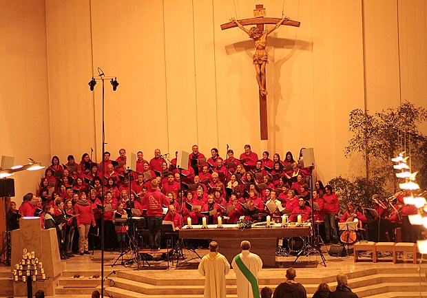 Chorgesang in einer nicht alltäglichen Dimension (Foto:Wörner)(tw) Am Samstagabend war bei der Vorabendmesse in der katholischen Kirche St. Josef der Chor "Maranatha" zu Gast um die musikalische Gestaltung des Gottesdienstes mit Chorgesang und Bandbegleitung zu übernehmen.