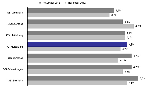 (bro) (aa) Von Oktober auf November ist die Zahl der arbeitslosen Menschen im Bezirk der Agentur für Arbeit Heidelberg um 128 auf 15.672 gesunken. Gegenüber dem Vorjahr ist die Arbeitslosigkeit jetzt um 1.131 höher. Die Arbeitslosenquote im November liegt unverändert bei 4,5 Prozent.