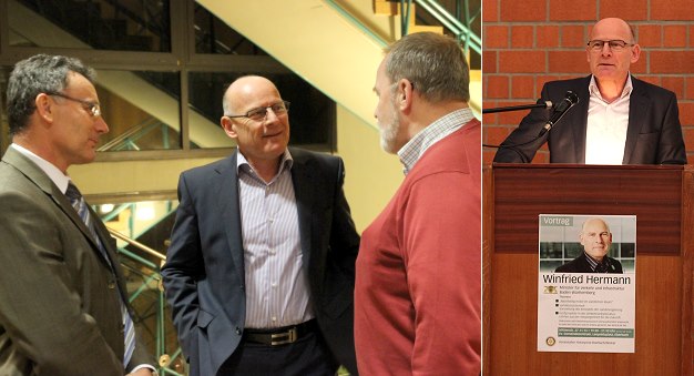 Winfried Hermann will nachhaltige Mobilität - Lokalpolitiker wollen Straßenausbau Minister Winfried Hermann am Rednerpult und im lockeren Gespräch mit Dietmar Polzin (l.) und Klaus Köppern vom Rotaryclub Eberbach. (Fotos: Hubert Richter)(hr) Einer der ranghöchsten Vertreter der Landesregierung Baden-Württembergs stattete Eberbach gestern Abend einen Besuch ab. Winfried Hermann, Minister für Verkehr und Infrastruktur, sprach im Evangelischen Gemeindehaus über nachhaltige Mobilität im ländlichen Raum.