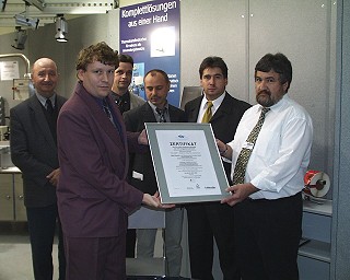 Beerfeldener Unternehmen zertifiziert Hinten v.l.: Prof. Erich Drescher, Qualitätsbeauftrager Jürgen Schork, Geschäftsführer Thomas Klotz und Geschäftsführer Emil Beck. In der vorderen Reihe: Günter Hutter (l.) und Geschäftsführer Lothar Beck. (Foto:privat)(hr) Im Rahmen der "Fachpack 2001" in Nürnberg wurde die Beerfeldener Firma BBK Etikettier- und Sondermaschinenbau GmbH im kleinen feierlichen Rahmen für das im Jahr 2001 umgesetzte Qualitätsmanagement nach DIN EN ISO 9001:2000 zertifiziert. Bei der Zertifikatsübergabe waren unter anderem der zuständige TÜV CERT-Auditleiter Günter Hutter vom TÜV Rheinland/Berlin-Brandenburg und REFA-Ingenieur Prof. Erich Drescher, der maßgeblich an der Erarbeitung eines Qualitätskonzepts im Hause BBK beteiligt war, anwesend. Die BBK Etikettier- und Sondermaschinenbau GmbH fertigt seit 1986 hochwertige Etikettier- und Sonderanlagen für alle Industriezweige und Produkte. In Deutschland entstanden mit den Jahren sechs Vertriebs- und Servicebüros. Im Jahr 2000 wurde man mit dem Innovationspreis des Odenwaldkreises ausgezeichnet.