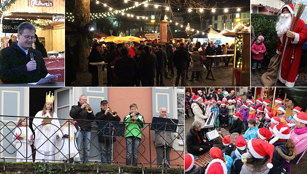 Mehrere Vereine und Privatanbieter hatten Buden und Zelte auf dem Thononplatz rund um den Kurpfalzbrunnen und im Ephratahof mit handgemachten Produkten und Naschereien bestückt. Am Freitagnachmittag wurde der Markt durch Bürgermeister Peter Reichert feierlich eröffnet (Bild links oben). Dazu spielte die Bläsergruppe des Fanfarenzugs Adventsmusik. Auch als sich am Samstagvormittag das Christkind (Emily Schneider) in Begleitung zweier kleiner Engel zeigte, waren die Bläser auf dem Balkon des Thalheim'schen Hauses wieder dabei (Bild links unten). Chöre der Steige-Grundschule (Bild rechts unten) und der Dr.-Weiß-Grundschule traten am Samstag auf, und am Sonntagnachmittag macht der Weihnachtsmann (Eugen Emmig) seine Runde.