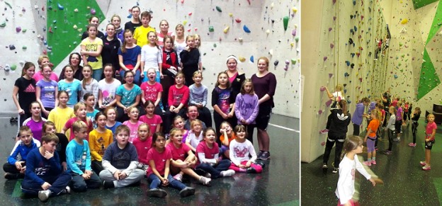 Nach eineinhalb Stunden wurde dann gewechselt. In den letzten 20 Minuten gaben die Profikletterer an der Wand mit der höchsten Schwierigkeitsstufen noch eine Vorführung zum Besten. Es gab auch ein besonderes Highlight. Ohne Vorwarnung ließ sich ein Kletterer von oben in den Raum herunterfallen und wurde erst kurz über den Köpfen der Kinder vom Seil wieder aufgefangen.