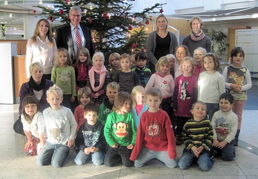 Die Kindergartenkinder und die Erzieherinnen wurden von Regionaldirektor Karlheinz Emig und Nicole Krickl begrüßt. Mit viel Freude schmückten die Kinder den Weihnachtsbaum mit ihrem selbst gebastelten Christbaumschmuck und erhielten dafür eine Spende in Höhe von 150 Euro.