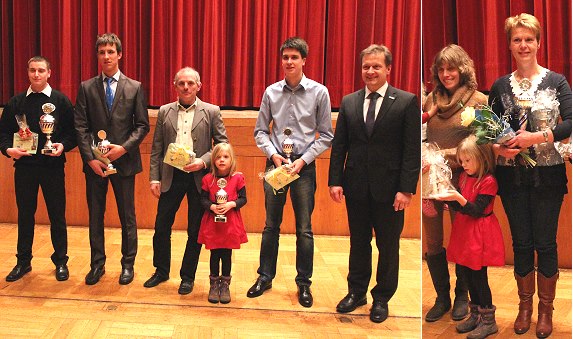 Auszeichnungen für herausragende Leistungen V.l. die Sportler des Jahres Lukas Friedrich (1.), Jannis Scheuenpflug (2.), Christof Diehl (3.) mit Tochter und Yannick Wörtz (3.) zusammen mit Bürgermeister Peter Reichert. Auf dem rechten Bild die zweit- und drittplatzierten Sportlerinnen des Jahres Angelika Merkel und Kerstin Liebsch (v.l.). (Fotos: Claudia Richter)Mehr Bilder (Klicken zum Vergrößern):