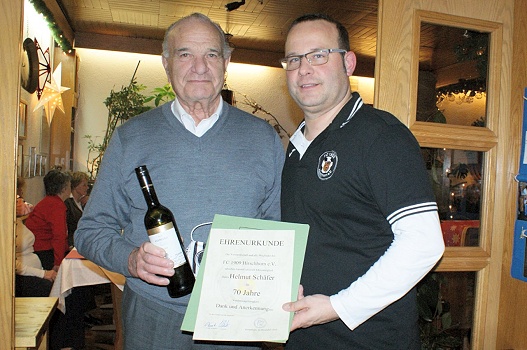 die Ehrenurkunde für 70 Jahre Mitgliedschaft. (Foto: privat)(bro) (ka) Am vergangenen Samstag, 14. Dezember, trafen sich Vereinsführung, Spieler, Mitglieder und Freunde des FC Hirschhorn zur Weihnachtsfeier in der "Goldenen Pfanne".