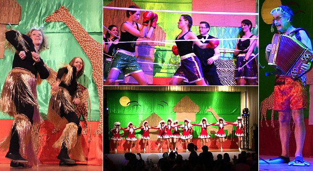 Unter der Regie von Carola Zimmermann und Detlef Liesenfeld gestalteten zahlreiche Aktive wieder ein buntes und abwechslungsreiches Programm mit allem, was zu einer Fastnachtssitzung dazugehört: Büttenreden, Tanzgarden, Schautänze und Schunkelrunden, zu denen Dennis Nussbeutel die passende musikalische Begleitung lieferte. Das Bühnenbild, für das auch Carola Zimmermann mit ihrem Team verantwortlich war, thematisierte den Kontinent Afrika, der auch den diesjährigen Kampagneorden der "Eulen" ziert.