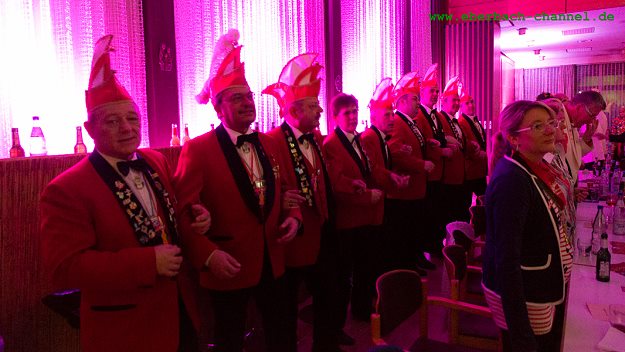 Ausverkaufte Sitzungspremiere an ungewohntem Ort Wegen der beengten Verhältnisse auf der Bühne des Pfarrheims hat der Elferrat seine Plätze an einer Seite des Saals. (Foto: Hubert Richter)Mehr Bilder (Klicken zum Vergrößern):