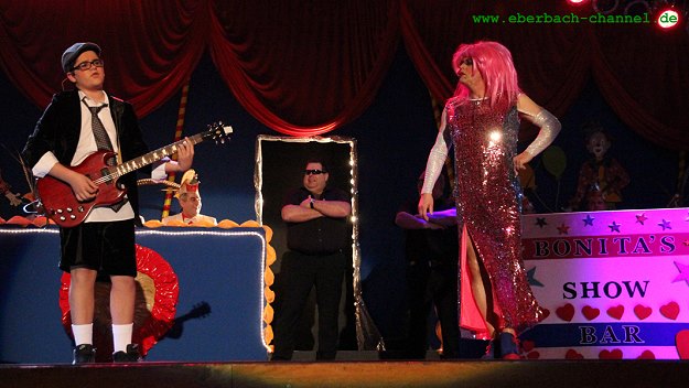 Im Finale stimmte Jürgen Huber dann wieder des Faschingshit "Viva Colonia" mit örtlich angepasstem Text "Feiern in Eberbach" an. Durch das Programm führte wieder Sitzungspräsident Ralph Brenneis mit Witzen und närrischen Sprüchen. Das Bühnenbild ist in diesem Jahr einem Zirkus nachempfunden. Musikalisch begleitet wurde der Abend durch die Feuerwehrkapelle Waldkatzenbach und, zum Auftakt, den Fanfarenzug der Stadt Eberbach.