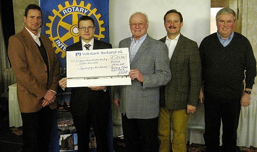 Der von Vizepräsident Arnt Heilmann übergebene Scheck über 1.230 Euro, gespendet von den Eberbacher Rotariern, ist ein wesentlicher Teil der Restfinanzierung des Mahnmals.