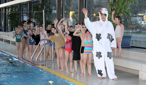 Ein farbenfrohes Bild von Kindern, die mit bunten T-Shirts, Nachthemden oder als Kuh verkleidetet waren, bestimmten das Bild im Hallenbad. Dabei stand nicht der sportliche Charakter im Vordergrund, sondern das ausgelassene Herumtollen. Zahlreiche Wasserspiele wie zum Beispiel eine Wasserpolonaise, Wassertrampolin oder "Über das Wasser gehen" rundeten das Faschingsschwimmen ab.