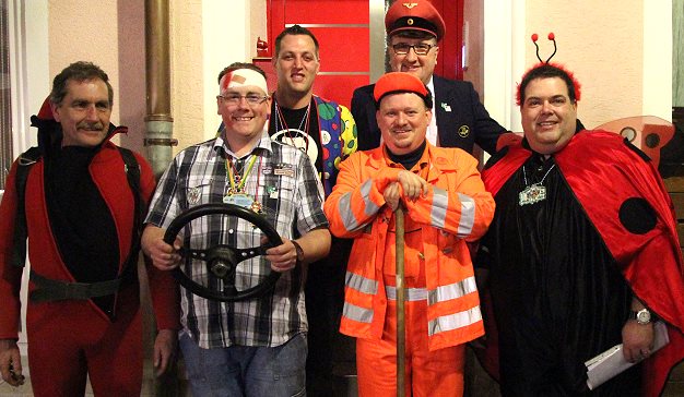 Hans-Georg Hold (als Mitarbeiter des städtischen Bauhofs), Christian Nahm (als Heimkehrer von einer Fastnachtssitzung), Benni Müller (als Fahrlehrer), Udo Geilsdörfer (als Marienkäfer) und "Rettungstaucher" Johann Bachl machten ab 21 Uhr wieder die Runde durch die Gasthäuser "Krabbenstein", "Adler", "Grüner Baum", "Pfalz" und das Sportheim des VfB. Begleitet wurden sie von Abordnungen der drei Vereine KG Kuckuck, Club Eulenspiegel und KG Urmel, die das närrische Event wieder gemeinsam auf die Beine gestellt hatten.