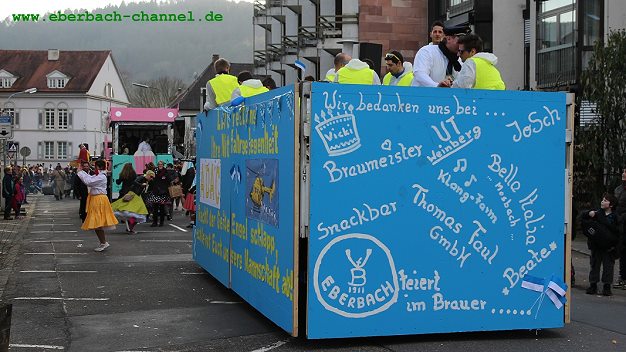 Mit dabei waren neben fast allen Gruppen der KGK, des Club Eulenspiegel, der KG Urmel und der Karnevalfreunde Haidebow weitere Teilnehmer aus Eberbach und den Ortsteilen, außerdem viele Gastgruppen aus der Region, z.B. aus Hirschhorn, Waldbrunn, Hesseneck, Sensbachtal, Neckargemünd. Für Musik auf dem Zugweg sorgten der Eberbacher Fanfarenzug, die Feuerwehrkapelle Waldkatzenbach sowie Guggenmusiken aus Aglasterhausen und Mauer.