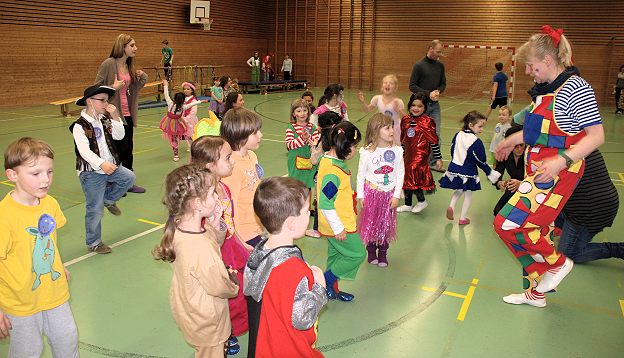 Kunterbunt ging es wirklich zu, als die Kinder zu Faschingshits tanzten und an zwölf abwechslungsreichen Geräten turnten. Für geschaffte Aufgaben erhielten die Kinder eine farbige Verzierung für ihren" Orden", den sie am Eingang erhielten. Am Ende war bei den meisten Kindern auch dieser "kunterbunt".