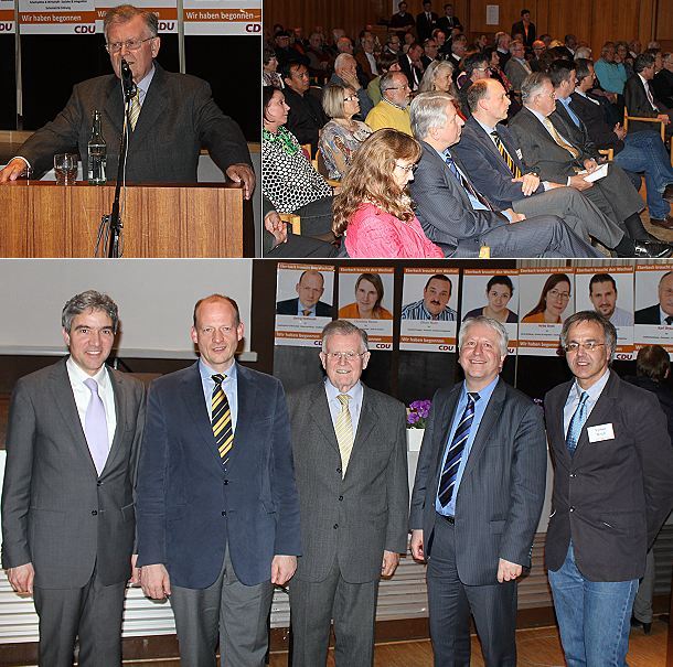 Aufbruch zur Metropolregion – Montagsforum der CDU (Bild unten v.l.) Dr. Stephan Harbarth MdB, Georg Hellmuth, Erwin Teufel, Prof. Bernhard Eitel, und Volker Brich. (Fotos:Tim Wörner)(tw) (tow)Mit dem ehemaligen baden-württembergischen Ministerpräsidenten Erwin Teufel (CDU) und dem Rektor der Universität Heidelberg, Prof. Dr. Bernhard Eitel, konnte die CDU Eberbach gestern Abend gleich zwei hochkarätige Referenten im Rahmen ihrer Veranstaltungsreihe "Montagsforum" präsentieren.