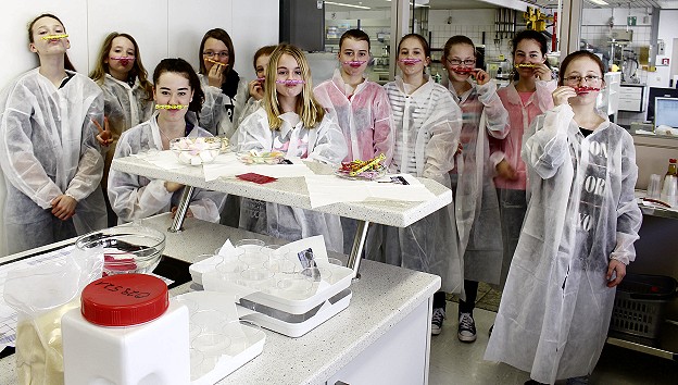 Am Nachmittag durften die Zwölf- bis Fünfzehnjährigen in den Berufsalltag des Chemielaboranten hineinschnuppern und eine Reihe kleiner Experimente eigenständig durchführen. Für einige von ihnen war der Umgang mit Messbechern und Petrischalen komplettes Neuland. Aber unter der fachkundigen Anleitung des Ausbildungsbeauftragten des Forschungslabors Peter Reiter warfen die Teilnehmerinnen ihre anfänglichen Berührungsängste schnell über Bord und waren bald mit Feuereifer bei der Sache. Höhepunkt des Tages war die Herstellung von Brause: Die Schülerinnen erhielten die Grundstoffe - Zucker, Zitronensäure, Natron, Farbstoffe und Aromen - und konnten so ihr eigenes Brausepulver ansetzen und mit verschiedenen Geschmacksrichtungen versehen. Die jungen Nachwuchswissenschaftlerinnen lernten dabei, dass die chemische Reaktion der Zitronensäure mit dem Natron die Brause zum Sprudeln bringt.