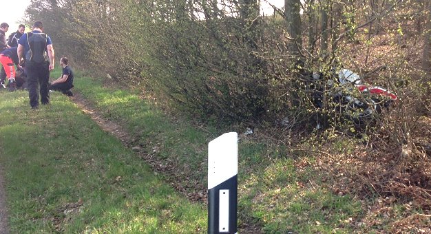 Kurz vor Schwanheim aus der Kurve geflogen (Foto: privat)(hr) Mit den Frühjahrstemperaturen steigt auch wieder die Zahl der Motorradfahrer auf den Straßen und damit das Risiko von Zweiradunfällen. Zwischen Eberbach und Schwanheim verletzte sich heute ein Biker bei einem Sturz erheblich.