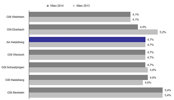 Arbeitslosenquote wieder leicht gesunken Arbeitslosenquoten im März. (Grafik: Bundesagentur für Arbeit)(bro) (aa) Von Februar auf März ist die Zahl der arbeitslosen Menschen im Bezirk der Agentur für Arbeit Heidelberg um 266 auf 16.424 gesunken. Gegenüber dem Vorjahr ist die Arbeitslosigkeit jetzt um 272 Personen höher. Die Arbeitslosenquote im März liegt bei 4,7 Prozent (-0,1 Prozentpunkt).