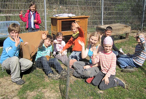 Zuerst stand für alle die Versorgung der Jugendfarmtiere auf dem Programm. Hier machten vor allem die jüngeren Kinder, aber auch Erwachsene erste Annäherungsversuche bei den Tieren und profitieren von der Erfahrung älterer Kinder. Es folgten ausgiebige Streichelrunden der Hasen und Meerschweinchen. Währenddessen lebten am Hüttenbaudorf viele Teilnehmer ihre Handwerksträume aus. Das Dorf wurde mit Hammer, Nägel und Säge verschönert und vergrößert. Zur Mittagszeit wurden über dem Lagerfeuer Würstchen, Hähnchen und Steaks gegrillt und Stockbrot gebacken. Bei fast sommerhaften Temperaturen machte danach ein ausgiebiges Sonnenbad besonders Freude. Gestärkt ging es nun auf eine Esel- und Pferdewanderung, bei der die Kinder auch reiten durften. Gemütliches Beisammensitzen und freies Spielen rundete die Veranstaltung ab.