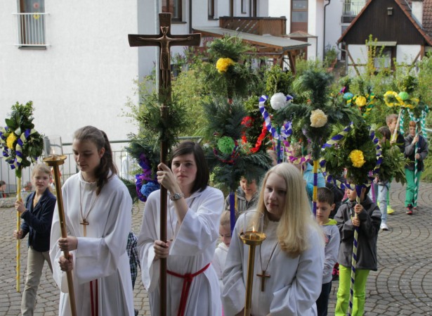 An diesem Tag gedenken die Katholiken weltweit des Einzugs Jesu in Jerusalem, wo er von den Menschen mit Palmzweigen begrüßt wurde. Traditionell beginnt der Gottesdienst auf dem Parkplatz vor der Kirche, wo Pfarrer Matthias Stößer "Palmstecken" und Zweige weihte. Die Palmstecken wurden am Vortag von den Eberbacher Kommunionkinder unter Anleitung von Frauen aus der Gemeinde St. Josef gebunden.