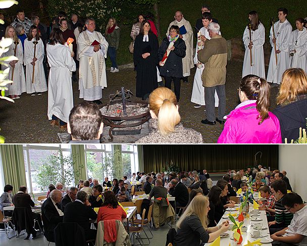 Frau Pfarrerin Anja Kaltenbacher, Herr Pfarrer Robert Oes, ein Pensionär aus Hirschhorn, der die Messe in St. Josef zelebrierte, und Diakon Joachim Szendzielorz gestalteten diesen ersten Teil der Auferstehungsfeier gemeinsam. Am Osterfeuer wurde das Osterlicht entzündet das den auferstandenen Christus symbolisiert, und das Exsultet gesungen. Nach einem Abschiedsgebet, in dem sich die Kirchengemeinden wechselseitig ein gesegnetes Osterfest wünschten, zogen beide Gemeinden in ihre Kirchen.