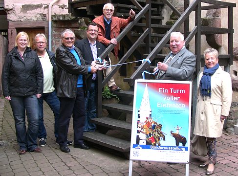 Die Ausstellung "Ein Turm voller Elefanten" wurde am Dienstagvormittag im Haspelturm im Beisein von Bürgermeisterstellvertreter Dieter Jeitner, Barbara Weis von der Tourist-Info, Konrektor der Werkrealschule Eberbach Richard Wurm und Christine Weiß vom Vorsitzenden des Bürger- und Heimatvereins Jens Müller, dem Ehrenvorsitzenden Günter Lipski und dem Leihgeber der Exponate Dr. Wolfgang Weiß eröffnet.