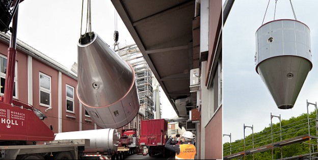 Elf Tonnen schwere Sprühkammer schwebt ein (Fotos: GELITA/Gaa Fotodesign)(bro) (mt) GELITA baut die Produktion am Standort Eberbach weiter aus. Auf dem Firmengelände fanden am 5. und 6. Mai spektakuläre Montagearbeiten statt. Zwei riesige Autokräne hievten in Zeitlupentempo die Herzstücke einer neuen Sprühtrocknungsanlage in einen 25 Meter hohen Stahlbau: eine sieben Tonnen schwere Filterkammer gefolgt von einer elf Tonnen schweren Sprühkammer.