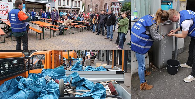 Kurz vor 13 Uhr kamen die Gruppen wieder zurück auf den Neuen Markt, wo die Eberbacher Werbegemeinschaft (EWG) eine Verpflegungsstation zur Stärkung nach getaner Arbeit aufgebaut hatte. Peter Reichert, der die Aktion selbst begleitet hatte, dankte den Helferinnen und Helfern. Er sei mehrfach auf die vorbildliche Idee angesprochen worden.
