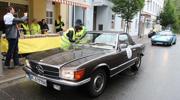 Die Fahrzeuge waren im Rahmen der Rallye "Rotary Charity Classics 2014" unterwegs,die vom Rotary-Club Heilbronn-Unterland veranstaltet wurde. In der Friedrichstraße war ein so genannter "Pitstop" eingerichtete, wo den Fahrerteams beim Café Viktoria ein "Coffee to go" gereicht wurde. So konnten die historischen Autos kurz von den Zuschauern bestaunt werden, die sich vom Regen nicht abhalten ließen und teilweise unter Markisen und Vordächern Schutz suchten.