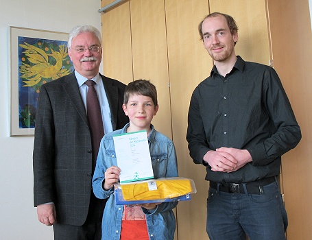Erster Preis beim Mathematik-Wettbewerb Känguru Der Preisträger Jonas Hils nimmt von Schulleiter Helmut Schultz und dem Mathematiklehrer Gerrit Konrad seinen Preis entgegen (Foto: privat)(bro) (pm) Unter den in Deutschland fast 900.000 Teilnehmern waren in diesem Jahr erstmals auch 15 Schülerinnen und Schüler des Hohenstaufen-Gymnasiums beim Mathematik-Wettbewerb Känguru vertreten. Jonas Hils aus der Klasse 7b gehört mit einer herausragenden Punktezahl zu den besten Teilnehmern seiner Altersklasse und erhielt dafür einen ersten Preis.