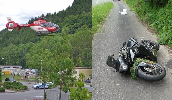 Schwer verletzter Biker und hoher Sachschaden (Fotos: privat)(hr) Schwer gestürzt ist heute Nachmittag ein 24-jähriger Motorradfahrer auf der L 2311 zwischen Eberbach und Gaimühle.