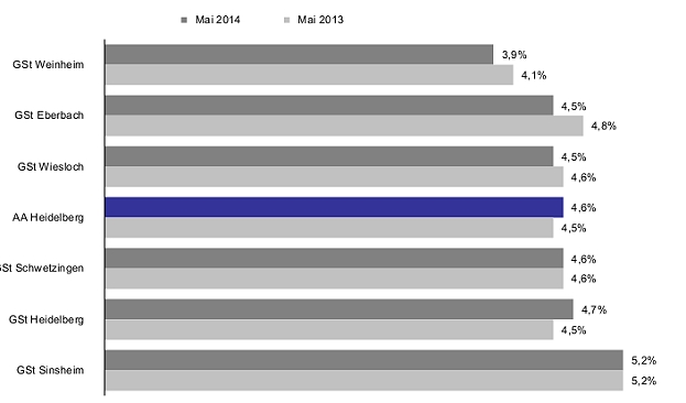 Leichter Rückgang der Arbeitslosigkeit Arbeitslosenquoten im Mai. (Grafik: Bundesagentur für Arbeit)(bro) (aa) Wie schon im Monat zuvor gab es auch im Mai einen leichten Rückgang bei der Arbeitslosigkeit, was dem Geschehen auf Landesebene entspricht. 16.211 Menschen waren im Heidelberger Agenturbezirk arbeitslos gemeldet - 206 weniger als vor einem Monat. Die Arbeitslosenquote verringerte sich auf 4,6 Prozent.