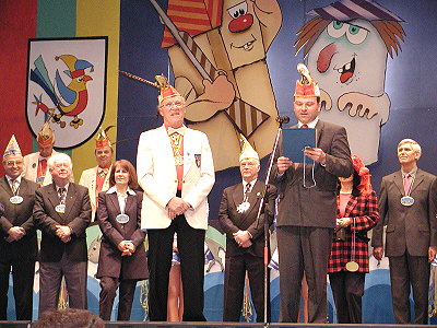 Lachender Eber an Karl Häffner (Foto:Wörner)(jc) (tw) Im Rahmen der gestrigen ersten Prunksitzung der KG Kuckuck überreichte Bürgermeister Bernhard Martin, mit viel Witz und Humor, den "Lachenden Eber" der Stadt Eberbach an den langjährigen Aktiven der Karnevalsgesellschaft, Karl Häffner.