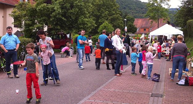 80 Kinder spielten auf der Dr.-Weiß-Straße  (Foto: privat)(hr) (ck) Stelzenlauf, Federball, Dosenwerfen, Gummitwist, Himmel und Hölle, Töpfern, Malen, Seilspringen, Schubkarrenrennen, Frisbee werfen und noch vieles mehr: Am vergangenen Mittwoch richtete die NAJU Waldbande zum ersten Mal in Eberbach den Weltspieltag aus, zu dem etwa 80 Kinder kamen.