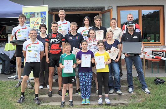 Ittertal MTB-Biathlon und oden-waelder MTB-Tour  Die Sieger der verschiedenen Altersklassen mit Biathlon Gesamtsieger Robin Siegel aus Oedheim (zweite Reihe, 3. v. li.). (Foto: privat)(bro) (fm) Beim siebten Ittertal Mountainbike-Biathlon am Samstag, 31. Mai, waren bei herrlichem Sonnenschein 40 Teilnehmer in verschiedenen Altersklassen am Start.