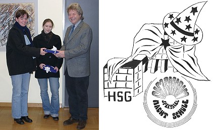 Es sei besonders hervorzuheben, so Wiedemer, dass die beiden prämierten Vorschläge so gut zueinander passen, dass sie in Zukunft gemeinsam alle Veröffentlichungen der Schule zu der geplanten Projektwoche zieren werden. Mit einem Buchpräsent für beide Gewinnerinnen bedankte sich der Schulleiter im Namen aller an der Projektgestaltung Beteiligten für diesen ersten gelungenen Auftakt von "Spektakel macht Schule".