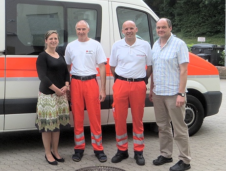 25 Jahre beim DRK V.l.: Caroline Greiner - Kreisgeschäftsführerin, Udo Baumann - Rettungsassistent, Timo Lind - Wachenleiter, Ralf Dussinger - Rettungsdienstleiter. (Foto: privat)(bro) (tl) Auf 25 Jahre im öffentlichen Dienst beim Deutschen Roten Kreuz konnte am 1. Juni Udo Baumann zurückblicken. Dem Mitarbeiter des Kreisverbandes Rhein-Neckar/Heidelberg gratulierte die Kreisgeschäftsführerin, Caroline Greiner, im Rahmen einer kleinen Feierstunde.