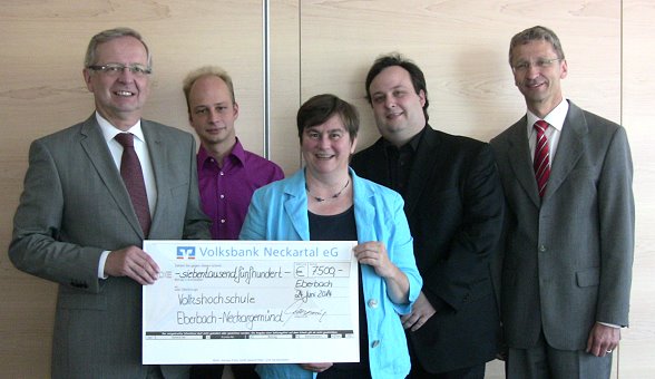 Unterstützung für mobilen Schulungsraum V.l. Ekkehard Saueressig, Lucifer Crispian Tonn, Barbara Coors, Alexander Braun und Ralf Gallion. (Foto: Claudia Richter)(cr) Anlässlich der zehnjährigen Kooperation im Bildungsbereich zwischen der Volksbank Neckartal eG und der Volkshochschule Eberbach-Neckargemünd e.V. (VHS) wurde heute von der Volksbank ein Scheck in Höhe von 7.500 Euro an die VHS überreicht. Das Geld wird für einen mobilen Schulungsraum eingesetzt.