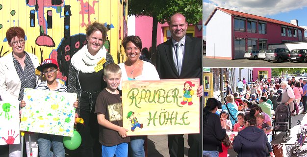 Einweihungsfeier nach Umbaumaßnahmen V.l. Elke Dahmen, Schüler Haydar Firat, Anja Krautschneider, Johannes Siefert, Nicole Schmitt und Oliver Grobeis mit dem neuen Namensschild für das A-Gebäude. (Fotos: Claudia Richter)(cr) An der Grundschule in Beerfelden wurde gestern nach aufwändigen Umbaumaßnahmen mit einem Tag der offenen Tür die Einweihung des neu gestalteten Schulgebäudes gefeiert. Die Schülerinnen und Schüler tauften ihren A-Bau auf den Namen "Räuber-Höhle".