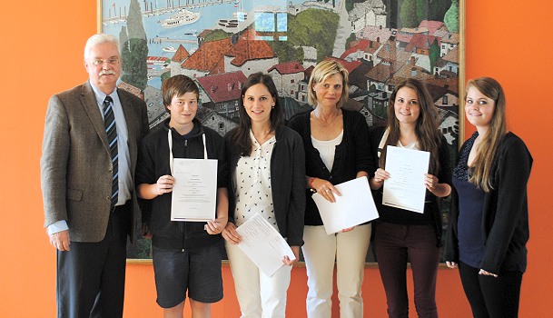 Am vergangenen Freitag überreichte OStD Helmut Schultz Jonas Bender und Karolin Klingmann, beide neunte Klasse, die Siegerurkunden für das Fach Englisch. Kerstin Klingmann aus der Kursstufe nahm die Teilnahmeurkunde gleich für zwei Fremdsprachen, Englisch und Französisch, entgegen.