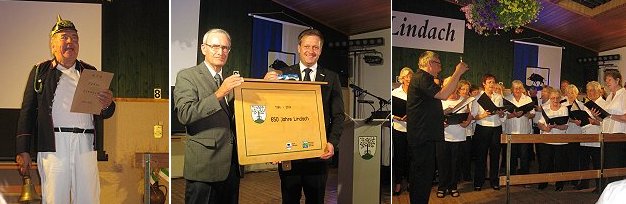 650 Jahre Lindach wurden gebührend gefeiert von links: Ortsbüttel Werner Morr; Bürgermeister Reichert übergibt Gedenktafel an Ortsvorsteher Neureuther; der Projektchor mit Dirigent Tobias Soldner (Fotos: Nicole Kolbe)(ko) Am vergangenen Samstagabend hatte der Eberbacher Stadtteil Lindach zum Festbankett anlässlich seines 650. Geburtstag ins festlich geschmückte Schützenhaus eingeladen und viele „Linischer“ sowie auch auswärtige Gäste waren der Einladung gefolgt.