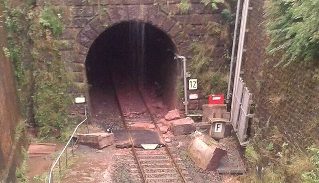 Zug raste in Sandsteinblöcke - Lokführer leicht verletzt (Foto: privat)(hr) Ein Zug der Odenwaldbahn blieb gestern auf der Fahrt von Eberbach nach Erbach im Krähbergtunnel kurz hinter Schöllenbach stecken, nachdem er große Sandsteinblöcke überrollt hatte. Die Fahrgäste mussten von der Feuerwehr evakuiert werden, der Lokführer wurde leicht verletzt.