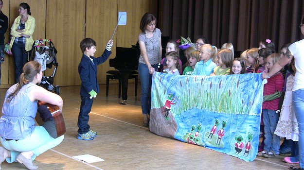 Julia Benz von der Musikschule und Kriemhild Pfeifer von der evangelischen Kirchengemeinde luden gemeinsam mit den "Musikgarten"-Kindern aus den evangelischen Kindergärten zu einem Konzert unter dem Motto "Heute ist ein Fest bei den Fröschen am See" ein. Im Vorfeld haben die Mädchen und Jungen mit Benz und Pfeifer Lieder, Tänze und rhythmische Spiele einstudiert, die sie am Nachmittag mit Hingabe vorführten. Aber nicht nur der musikalische Bereich begeisterte die anwesenden Eltern, Großeltern und Geschwisterkinder. Auch schauspielerisch überzeugten die jungen Künstlerinnen und Künstlern in den unterschiedlichsten Rollen.