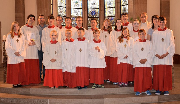 Am Ende des Gottesdienstes wurden außerdem Alessandra Barth und Fabian Stuck aus dem aktiven Ministrantendienst verabschiedet. Ihr ehemaliger Oberministrant Cornelius Wolff bedankte sich bei ihnen im Namen der ganzen Gemeinde für ihren langjährigen Dienst und überreichte ihnen Urkunden. Insgesamt haben sie in sechs bzw. zehn Jahren in über 500 Gottesdiensten ministriert.